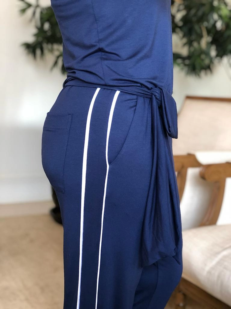 Macacão em malha, sem mangas e comprimento longo. Abotoamento nas costas e acompanha faixa na cintura. Conforto e muito estilo.
