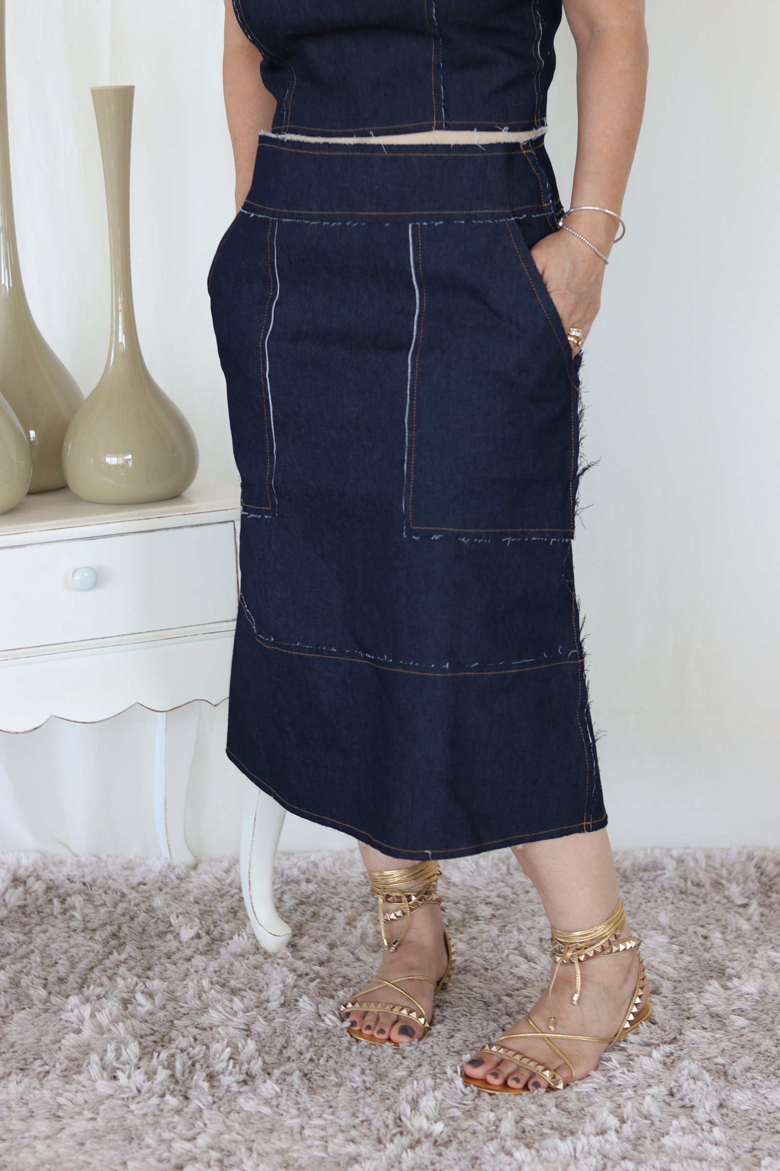Essa saia é um arraso absoluto para quem busca um toque elegante e contemporâneo. O jeans de lavagem escura com leve stretch não só adiciona sofisticação, mas também garante conforto. A modelagem evasê e o cós anatômico proporcionam um caimento impecável, enquanto o fechamento com zíper na parte de trás adiciona um toque refinado.