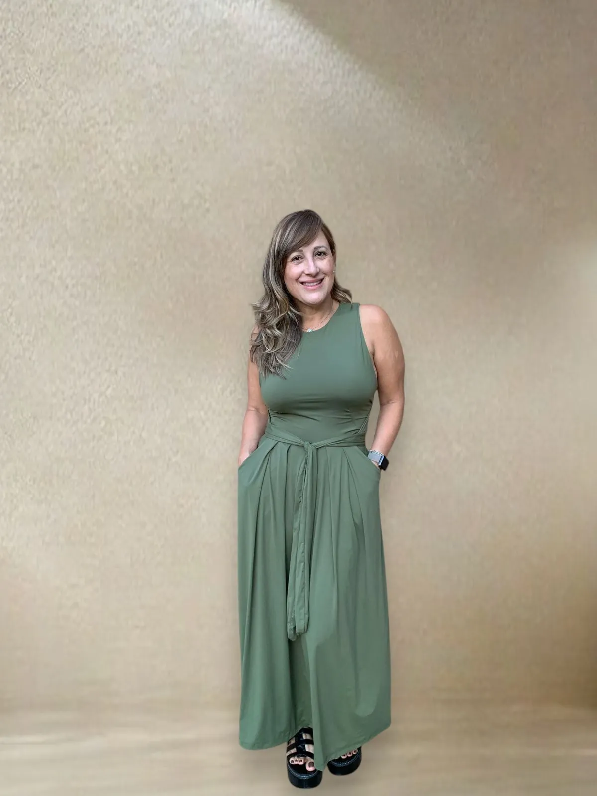 O modelo regata traz um charmoso transpasse nas costas, deixando-o moderno e feminino. A cintura marcada com faixa garante ajuste perfeito ao corpo, enquanto as pregas na saia conferem movimento e sofisticação à peça.