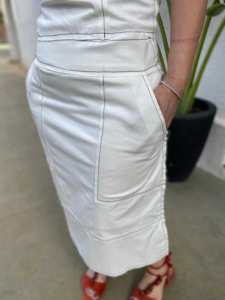 Essa saia é um arraso absoluto para quem busca um toque elegante e contemporâneo. O jeans de lavagem escura com leve stretch não só adiciona sofisticação, mas também garante conforto. A modelagem evasê e o cós anatômico proporcionam um caimento impecável, enquanto o fechamento com zíper na parte de trás adiciona um toque refinado.